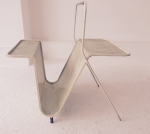 A painted and pierced metal magazine rack with gilded metal details. Design by Mathieu Matégot.